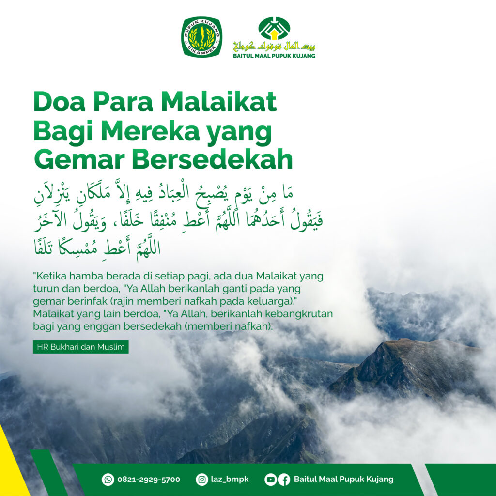 “Ketika hamba berada di setiap pagi, ada dua Malaikat yang turun dan berdoa, “Ya Allah berikanlah ganti pada yang gemar berinfak (rajin memberi nafkah pada keluarga).” Malaikat yang lain berdoa, “Ya Allah, berikanlah kebangkrutan bagi yang enggan bersedekah (memberi nafkah).” (HR Bukhari dan Muslim)